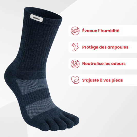 96% de nos clients constatent qu’ils peuvent marcher plus longtemps, ou courir sans ampoules grâce aux chaussettes Runor.